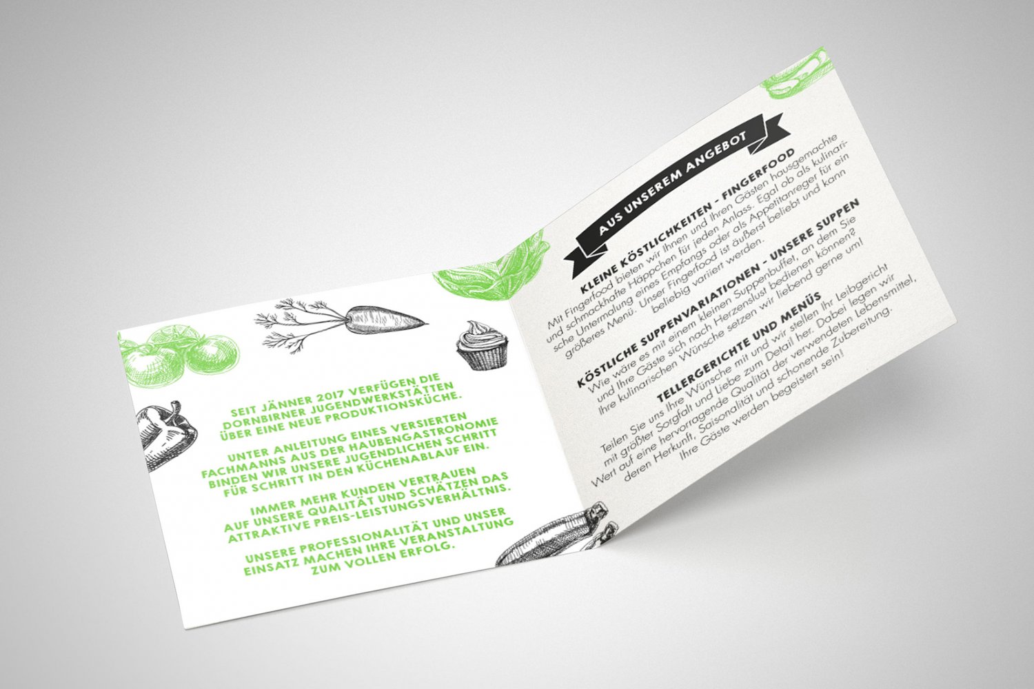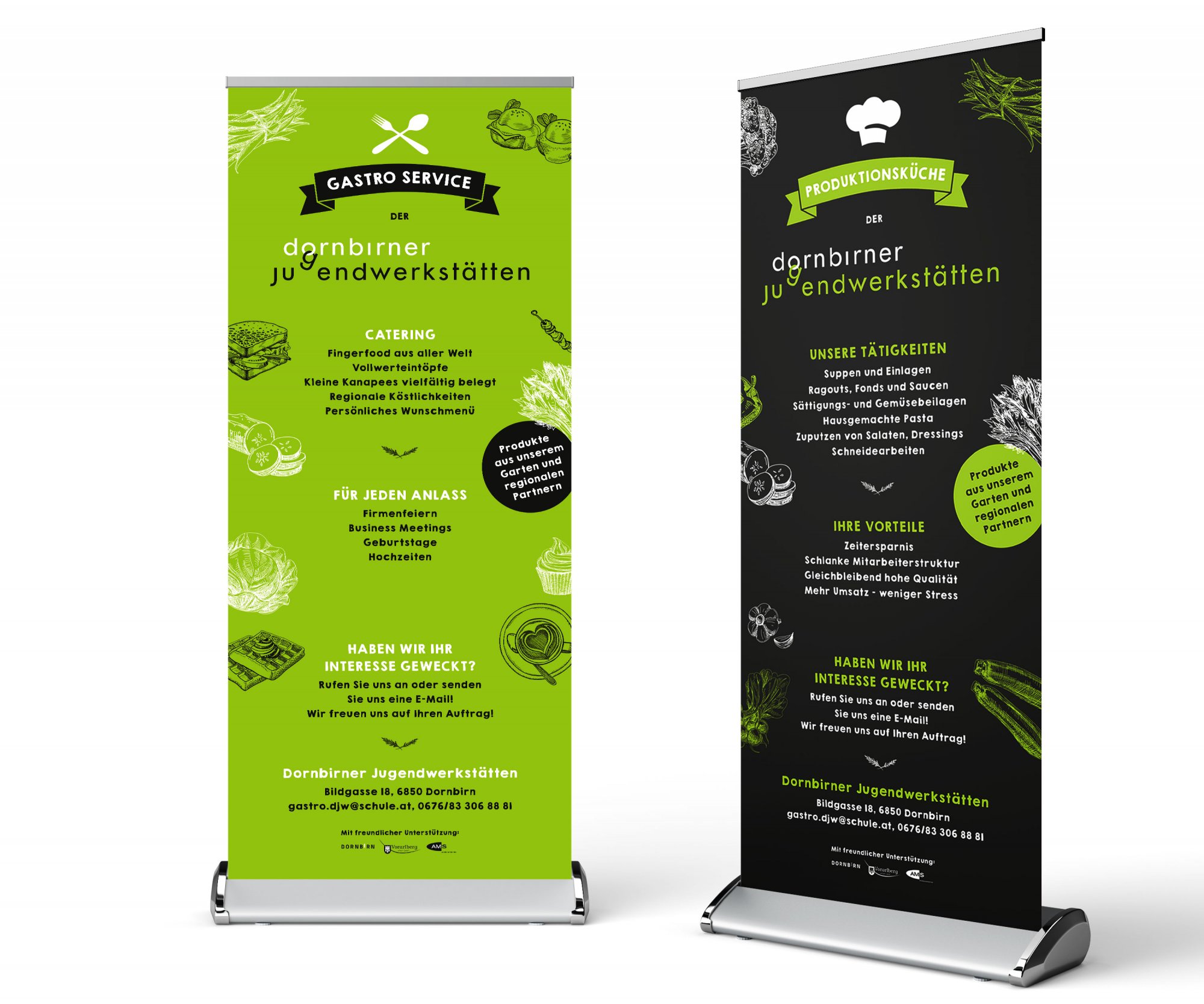 Die Dornbirner Jugendwerkstätten sind ein Arbeitstag- und Bildungsprojekt für langzeitarbeitslose Jugendliche. Für ihre neuen Bereiche „Gastroservice & Produktionsküche“ durften wir die Werbemittel und Etiketten für deren Produkte gestalten.