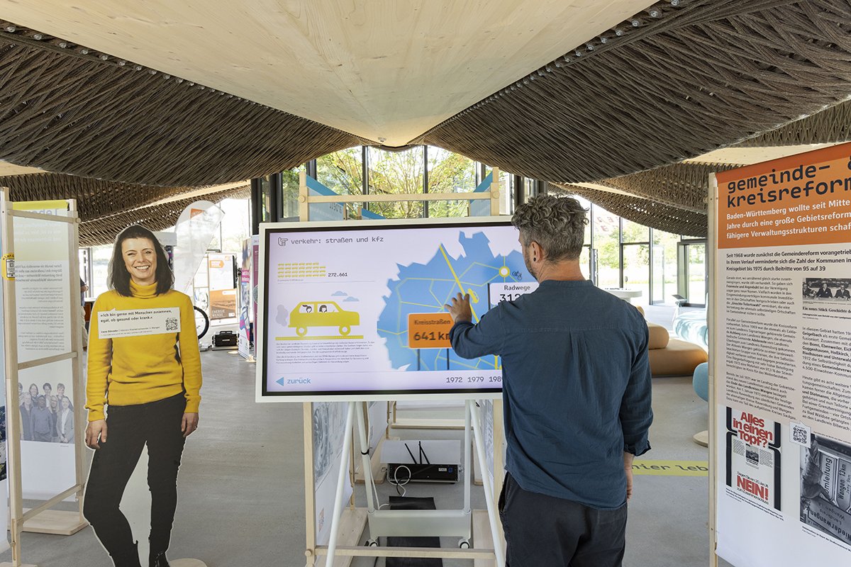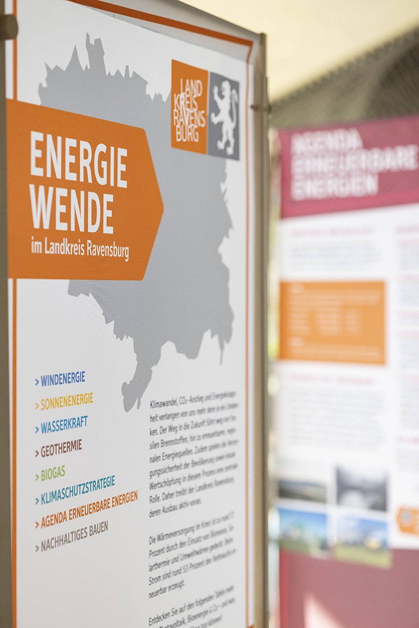 Im Innenraum wurde von uns eine ansprechende, piktografische Übersichtskarte des Landkreises und die Möbel für den Teil der Landkreispräsentation entworfen. Zudem können sich die Besucher die informative Ausstellung „Energiewende im Landkreis Ravensburg" und die Jubiläums-Wanderausstellung „hier leben" ansehen.