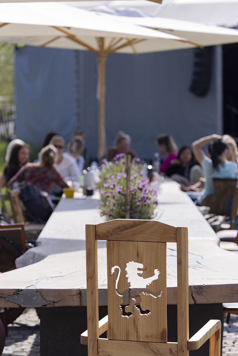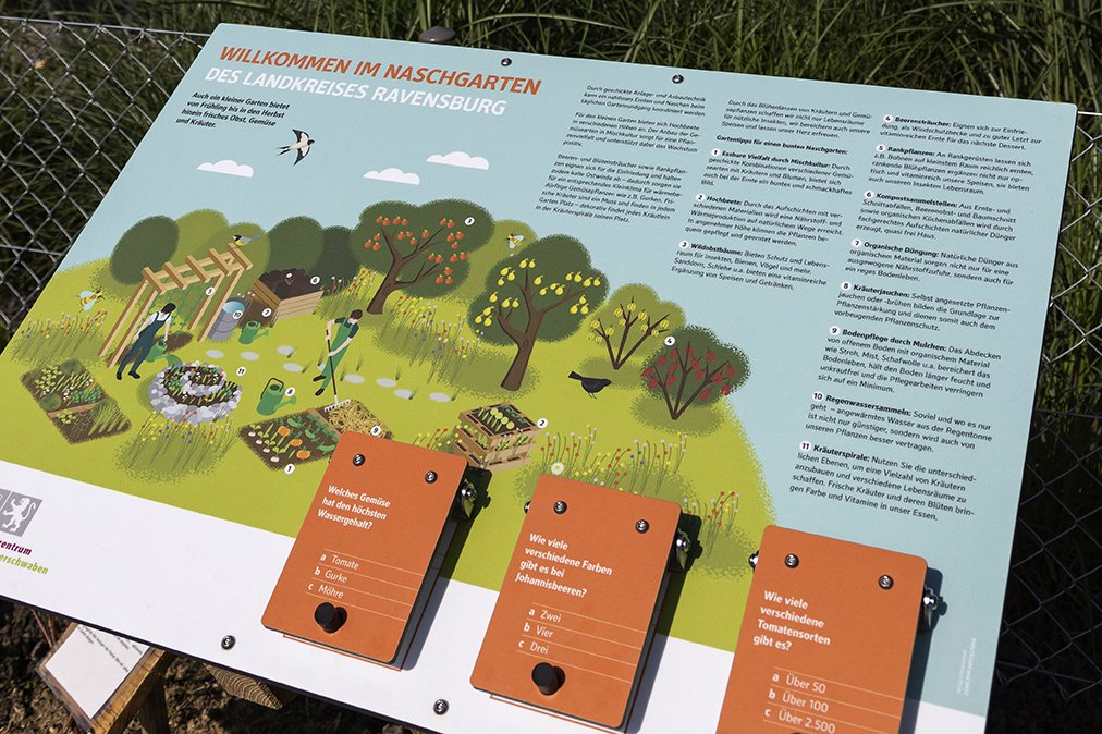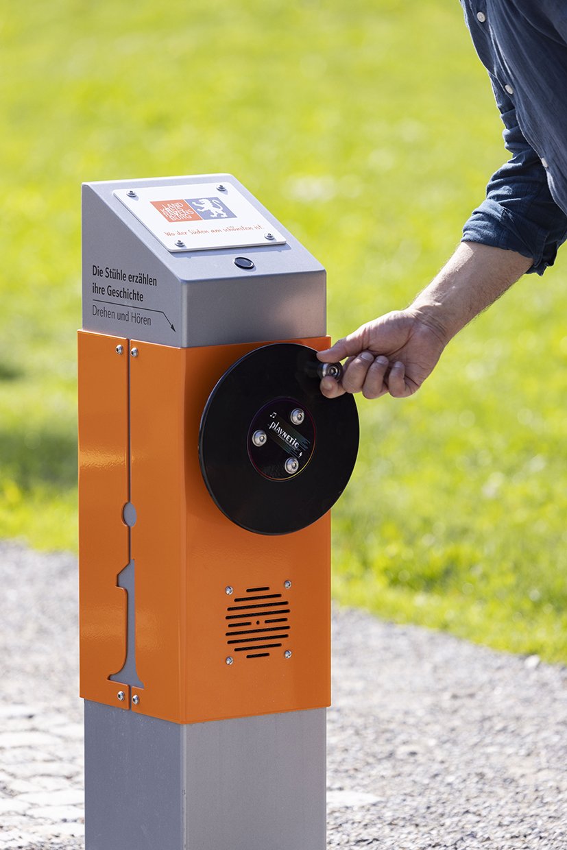 Der Landkreis Ravensburg präsentiert sich auf der Landesgartenschau Wangen 2024 im und am Flachsfaserpavillon auf der großen Argenwiese. Dafür haben wir das Leitsystem mit Stelen, Garten-Infotafeln mit Quizklappen, Pflanzschilder und einen Saatgutautomaten gestaltet. Für den Landkreistisch haben wir den Gemeinden aufgetragen, uns „Stühle mit Geschichten“ zu liefern. Über eine Hörstation oder einen QR-Code lassen sich die einzelnen - im Dialekt gesprochenen - Geschichten nun anhören.