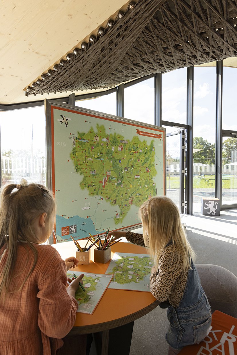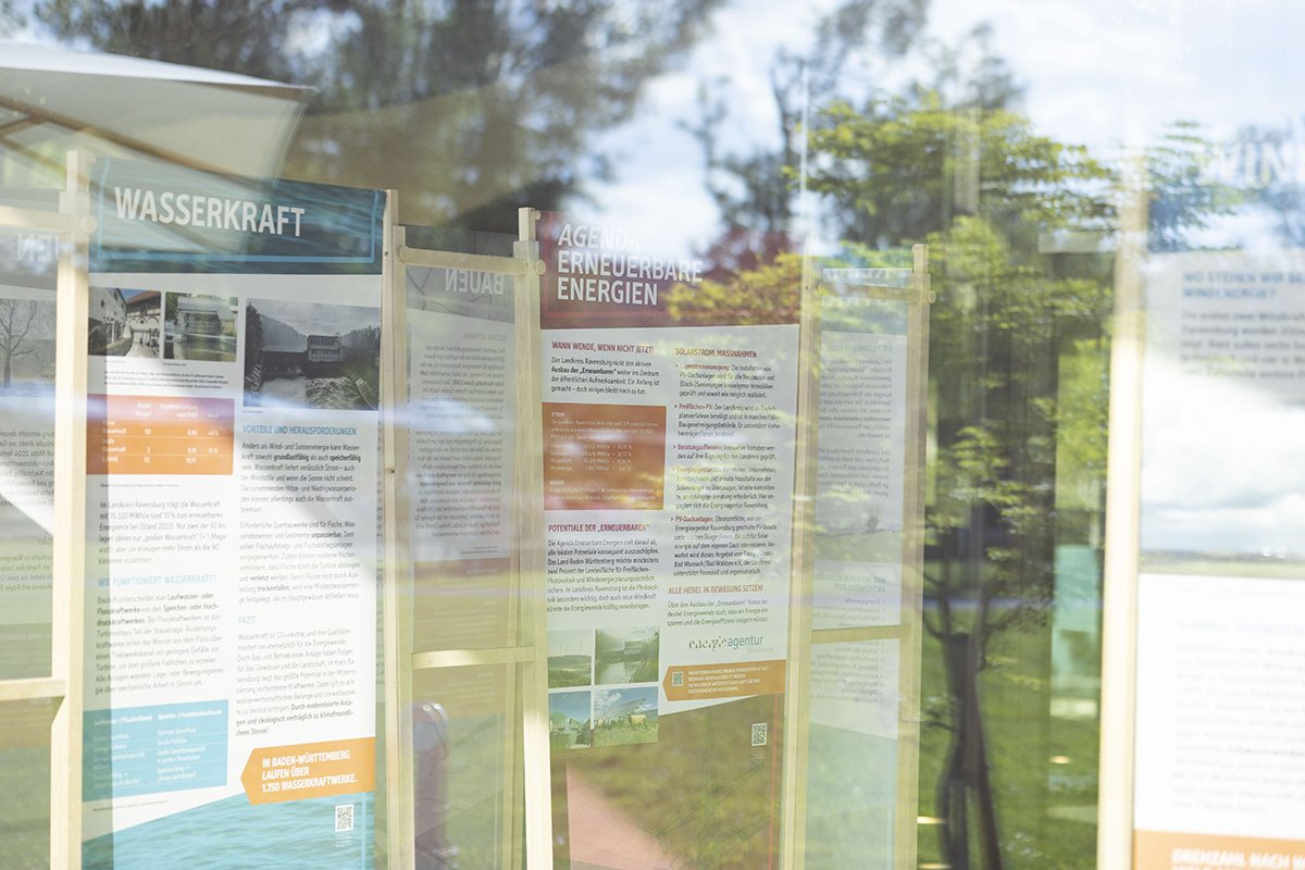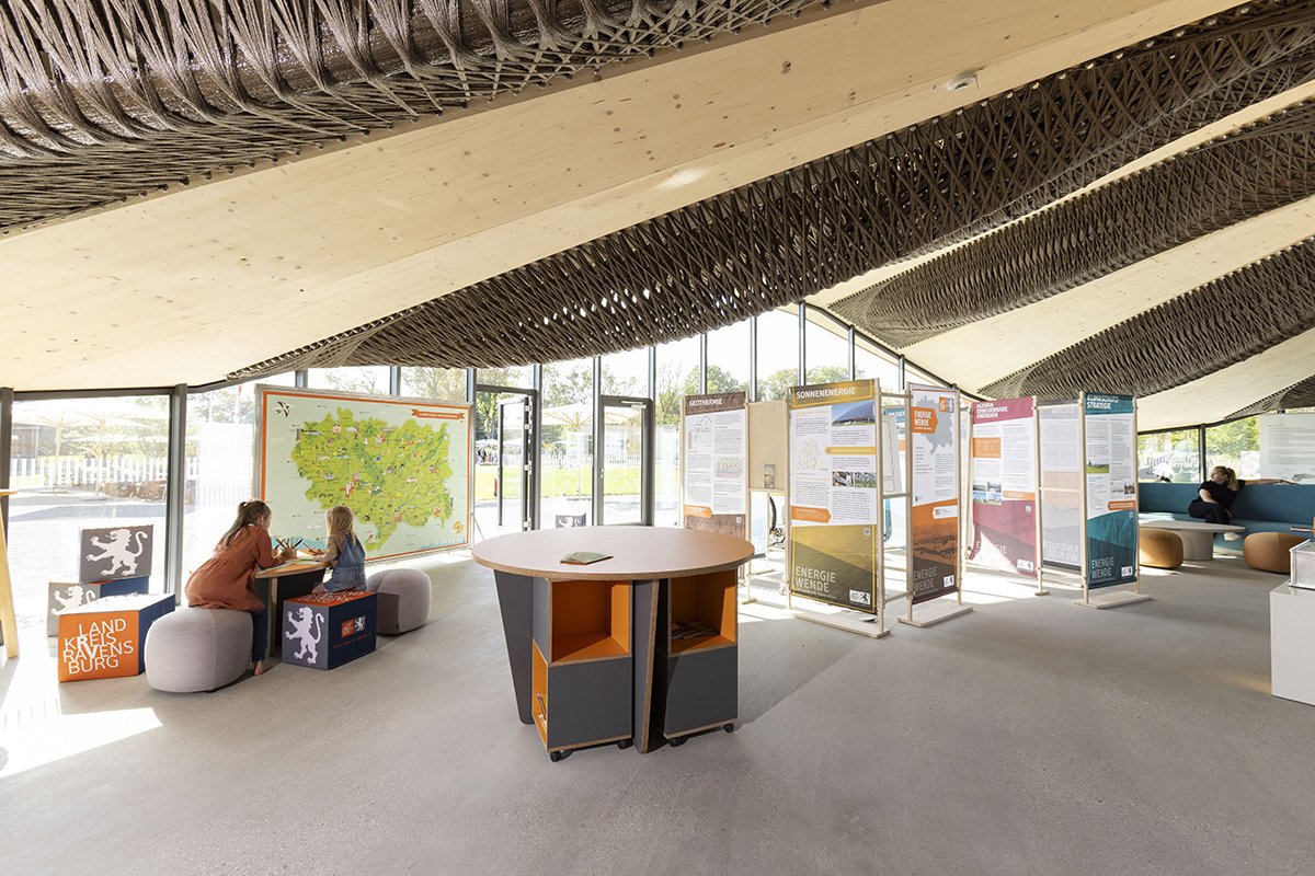 Im Innenraum wurde von uns eine ansprechende, piktografische Übersichtskarte des Landkreises und die Möbel für den Teil der Landkreispräsentation entworfen. Zudem können sich die Besucher die informative Ausstellung „Energiewende im Landkreis Ravensburg" und die Jubiläums-Wanderausstellung „hier leben" ansehen.